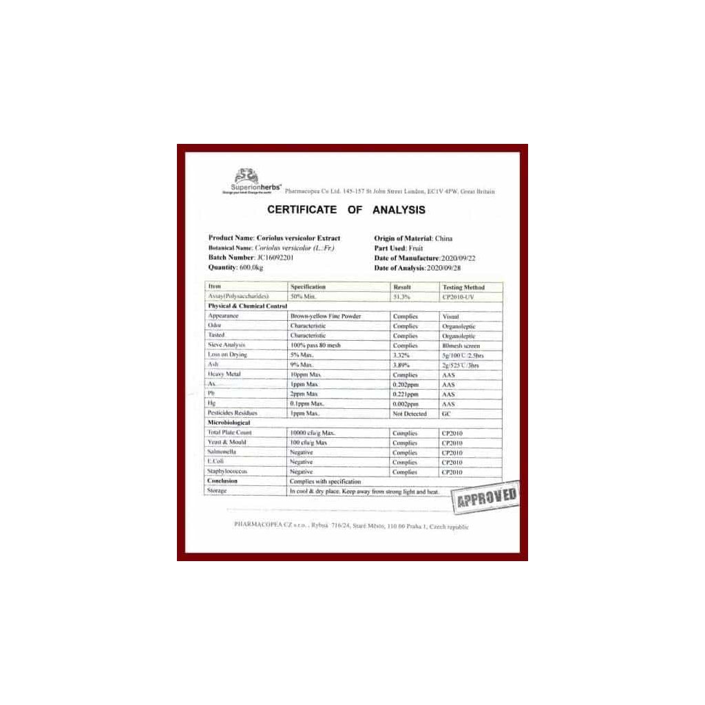Koncentrace polysacharidů v produktu Coriolus versicolor Extrakt je 50%. To zajišťuje vysokou účinnost produktu.